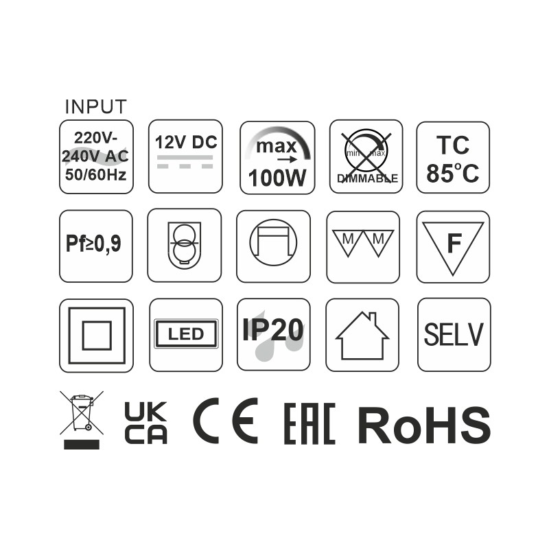 ZASILACZ LED Basic 100W zasilany jest napięciem przemiennym o wartości 200-240VAC~50Hz. Obniża napięcie wyjściowe do 12V DC.