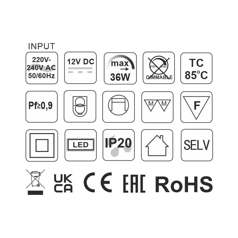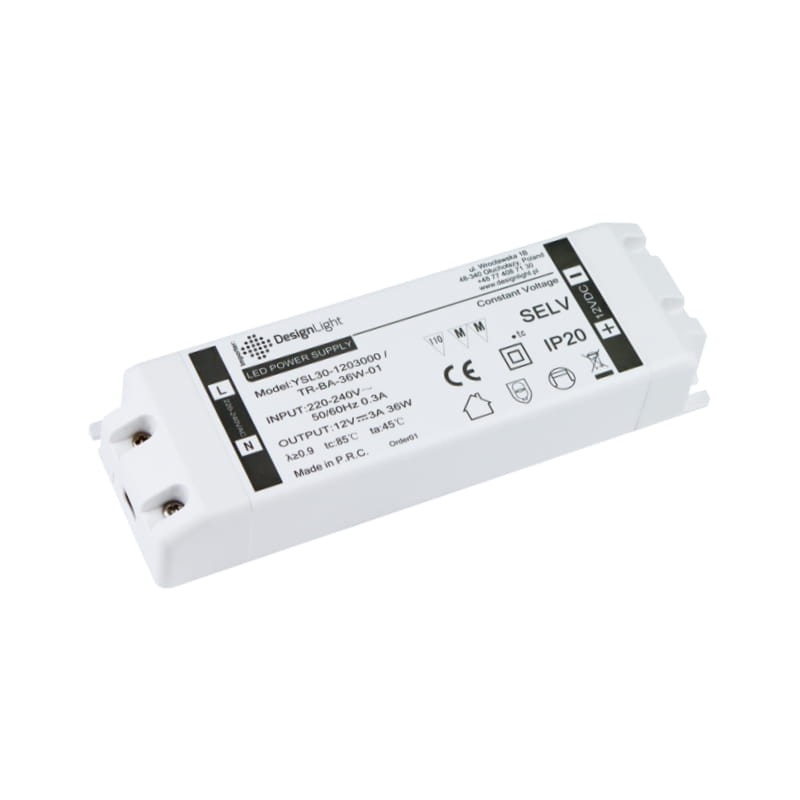 Zamknięty jest w obudowie izolacyjnej z tworzywa sztucznego w kolorze białym. Jego przeznaczenie to zasilanie oświetlenia LED o napięciu 12V DC i łącznej mocy nie przekraczającej 36W. Maksymalna temperatura pracy to 75 stopni C. Posiada wejściowe i wyjściowe zaciski przyłączeniowe.